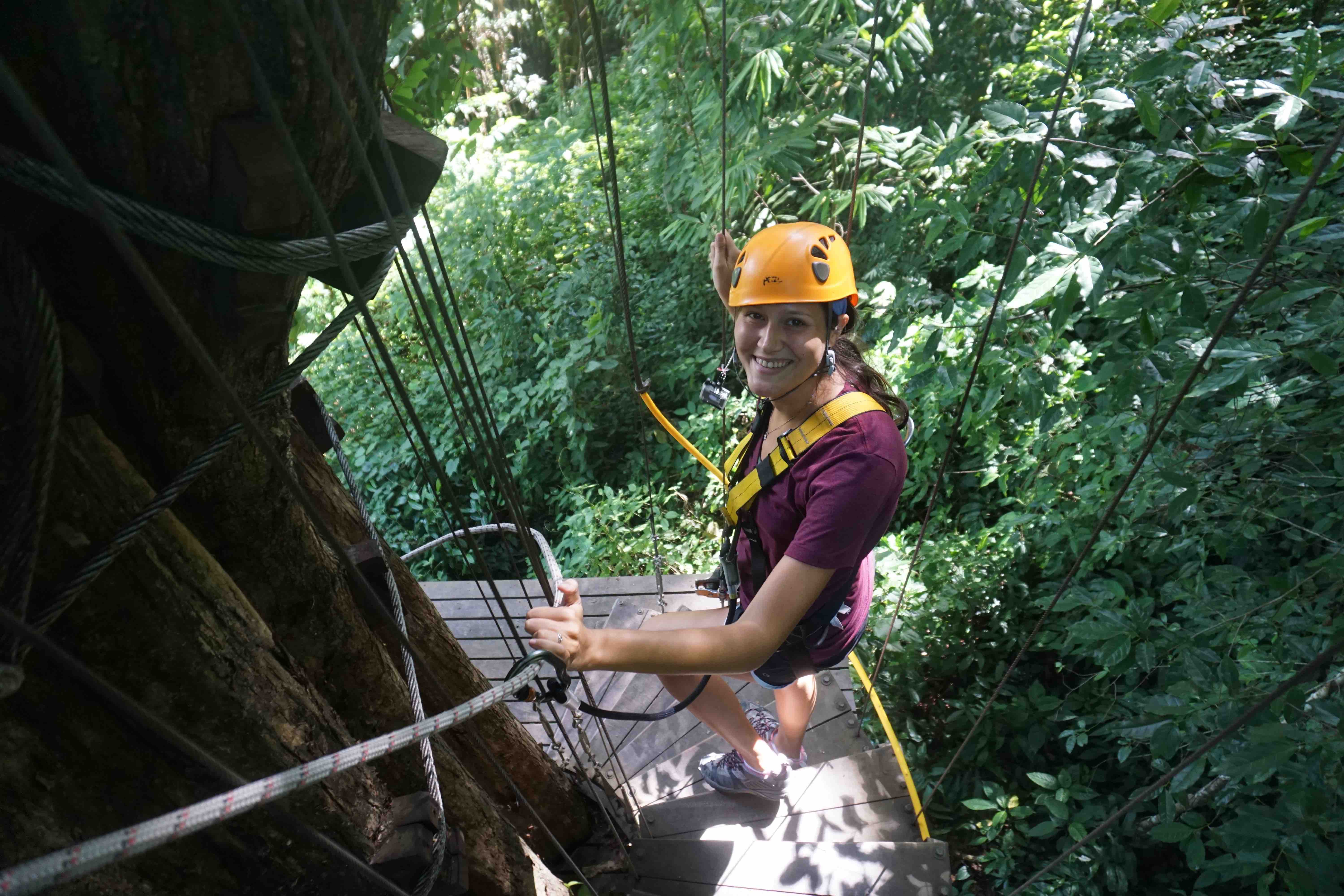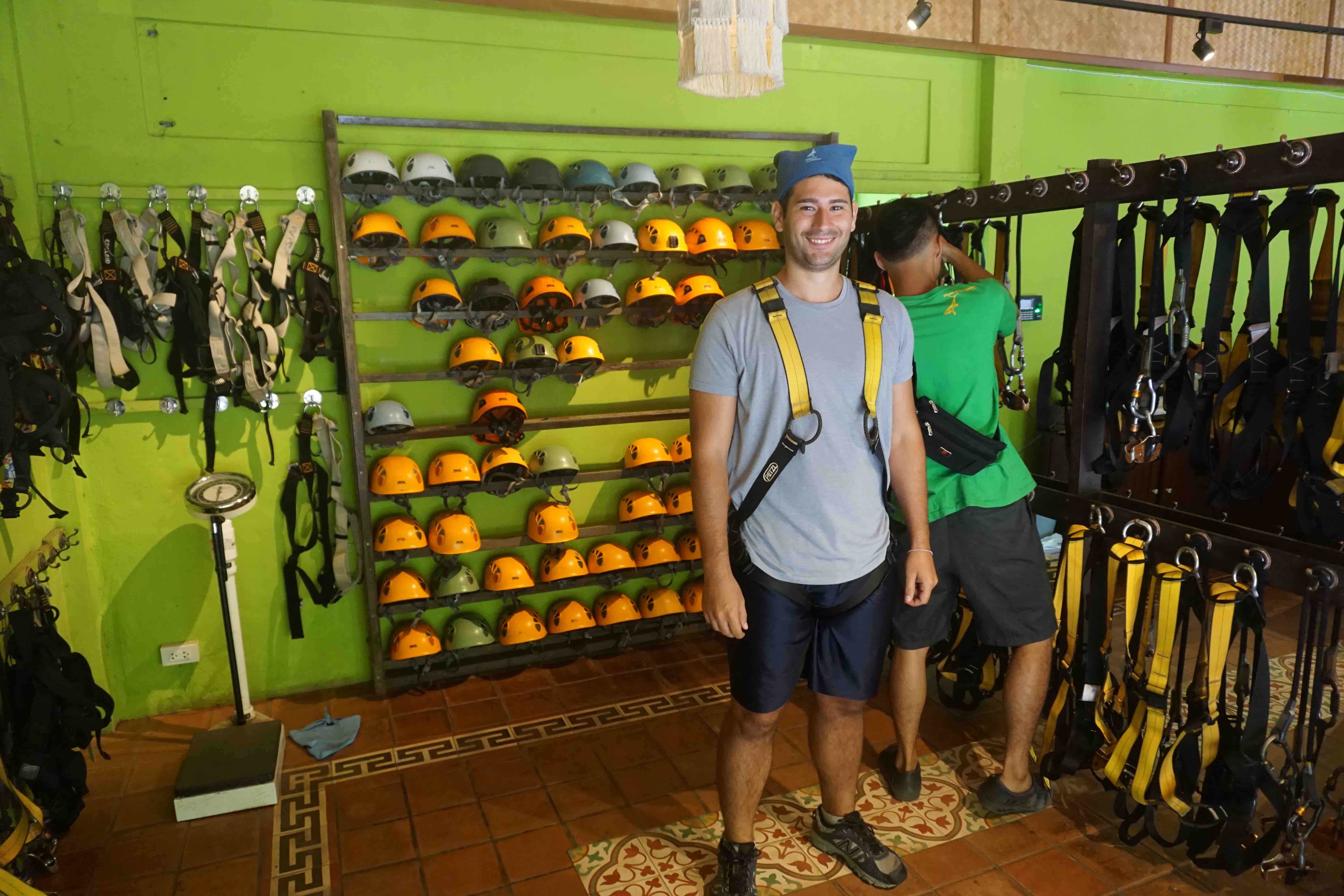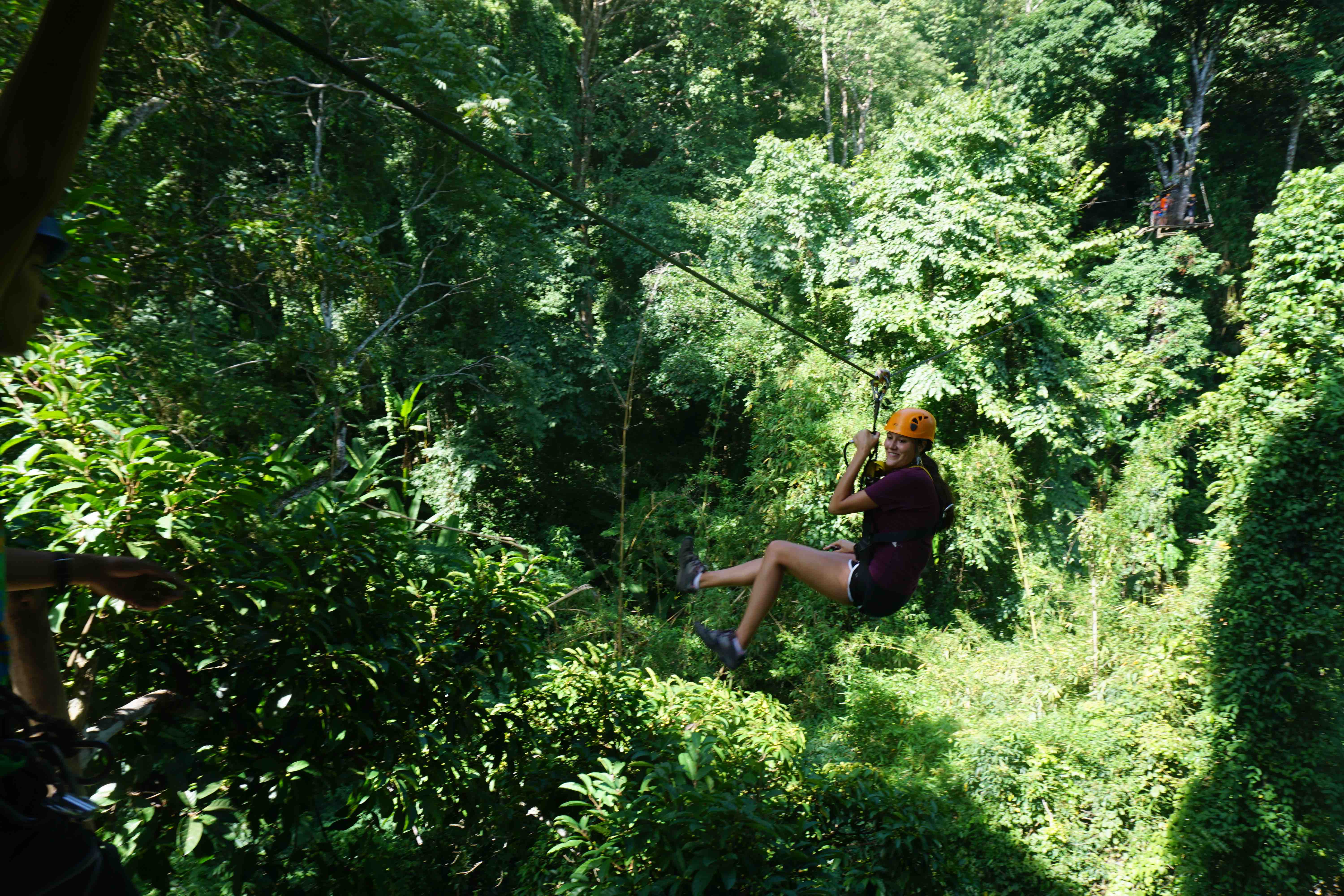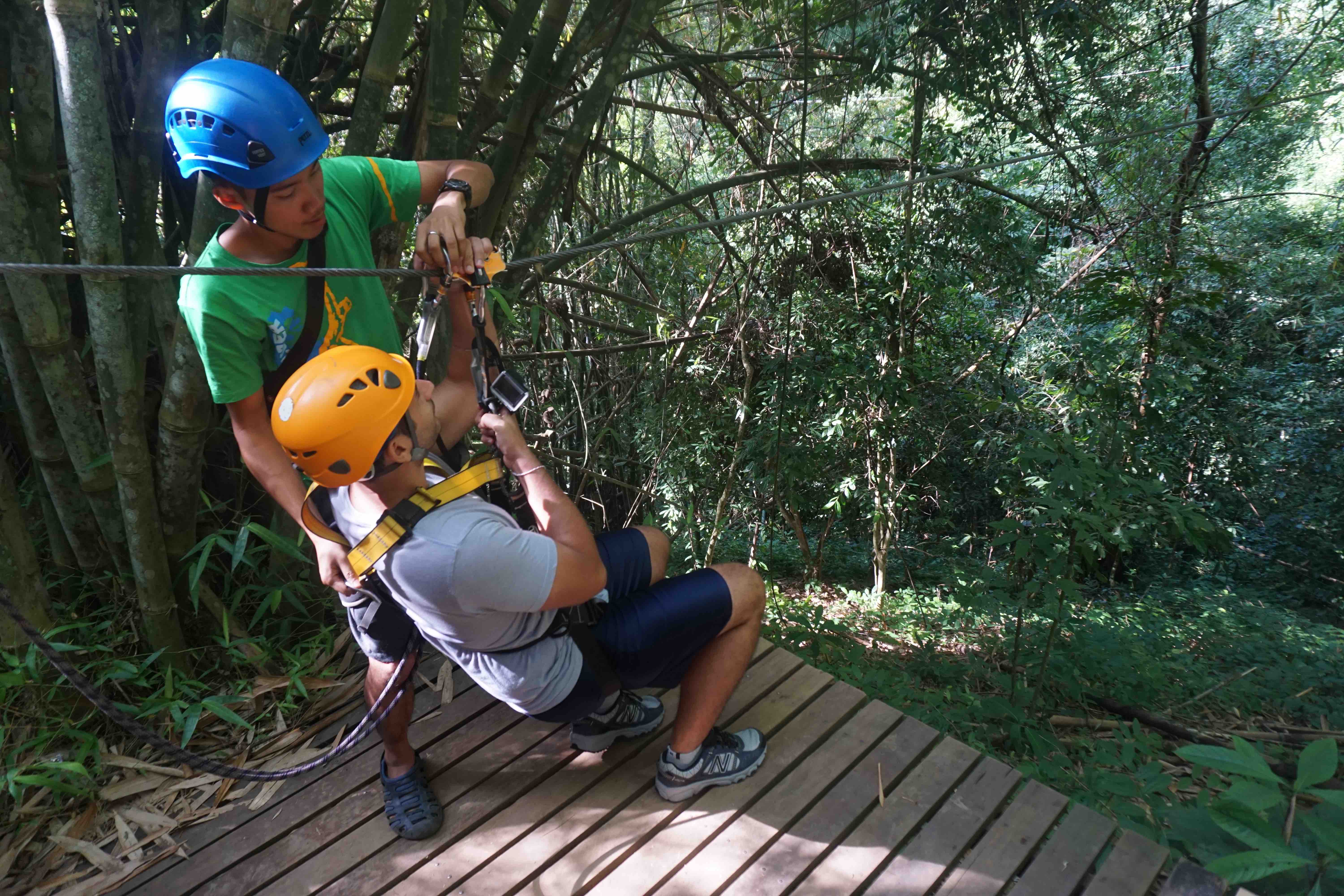 July 7, 2015 | talktraveltome | Leave a comment Since we weren’t home to celebrate America’s birthday, we wanted to do something memorable to take our minds off of the fireworks, barbecues and beach parties we were missing back in the USA. We figured, what better way to celebrate the anniversary of America’s independence than zipping through a forest with Gibbons cheering us on?! So this year, to celebrate the 4th of July we booked a ziplining adventure through the Thai Rainforest with Flight of The Gibbon. Our day started bright and early when the van picked us up from our hotel at 6:30 in the morning. Normally, we’d have a hard time getting out of bed so early, but the thought of zipping across 5km of rainforest, including Asia’s longest zipline (it’s roughly 800 meters!), made waking up at 5:30am fairly easy. When the van arrived we met the rest of our group consisting of 6 other people, two of which were from New York! It’s always fun meeting people from your neck of the woods when you’re abroad, especially on America’s Birthday! The car ride takes about an hour from the center of Chiang Mai, during which they showed us a brief video giving a quick safety tutorial and run down on what to expect. We have to say, from the minute we were picked up Flight of the Gibbon did an amazing job making everyone feel extremely comfortable and safe. Once we arrived we met our two guides, Paik and Sunit (AKA Sunny), who strapped us into our harnesses and got us ready for the day ahead. After another quick ride we were ready to start flying! We weren’t sure what to expect when we got to the first platforms (after all, only Nick had been ziplining before and that was more than 10 years ago), but as soon as we arrived we were relived. The platforms looked like they could have been brand new and all of the gear they use can hold more than 15 times the weight that they actual subjected it to… we were happy to hear this since we’ve been stuffing our faces with delicious Thai food for the past week. The first couple of zips were only about 50 to 100 meters long to get everyone feeling comfortable with letting a stranger push us off a platform almost 70 meters high, but after the first few times we were feeling great and ready for the famous 800 meter zip! Throughout the day we were zipping and zooming through the tree canopy, climbing over suspension bridges and repelling down platforms. We felt like Superman and Spiderman all rolled into one… We might be on the brink of the next great superhero! Oh and did we mention that we were lucky enough to catch a glimpse of a few Gibbons?! What is a Gibbon? It’s a small, tree loving ape that might just be the cutest thing on earth! All we’re saying is we wouldn’t mind having a few Gibbons swinging around us in NYC. Overall, it took us about two hours to complete the course, which seemed to fly by (get it?? FLY by!). After finishing the final repel there was a car waiting to take us back to the Flight of the Gibbon headquarters. Once we got back we were greeted with a full spread of delicious Thai dishes for lunch. After we finished scarfing down our food and enjoying a Tiger Beer at 11:00 in the morning (it’s every American’s duty to drink at least one beer on the 4th of July where ever you are in the world), there was an option to take a five minute ride to a local waterfall. We talked it over with our group and decided that we all definitely wanted to check it out. The waterfall wasn’t the most impressive and the 10 minute walk climbing up what seemed to be endless steps didn’t help it’s cause. However, on our way back we made up for the disappointing waterfall by stopping at a local coffee shop. This might not sound very exciting, but it was up in the mountains overlooking the rainforest making for an incredible view to enjoy a cup of coffee. We both sipped some iced cappuccinos to help cool down after our waterfall trek. Although we weren’t home to celebrate the 4th of July, we think ziplining and screaming like 5 year olds through the Thai Rainforest more than made-up for the all the beer pong games and fireworks we missed at home! Thank you Flight of the Gibbon for hosting us during our trip. As always, our opinions are our own as we Talk Travel!