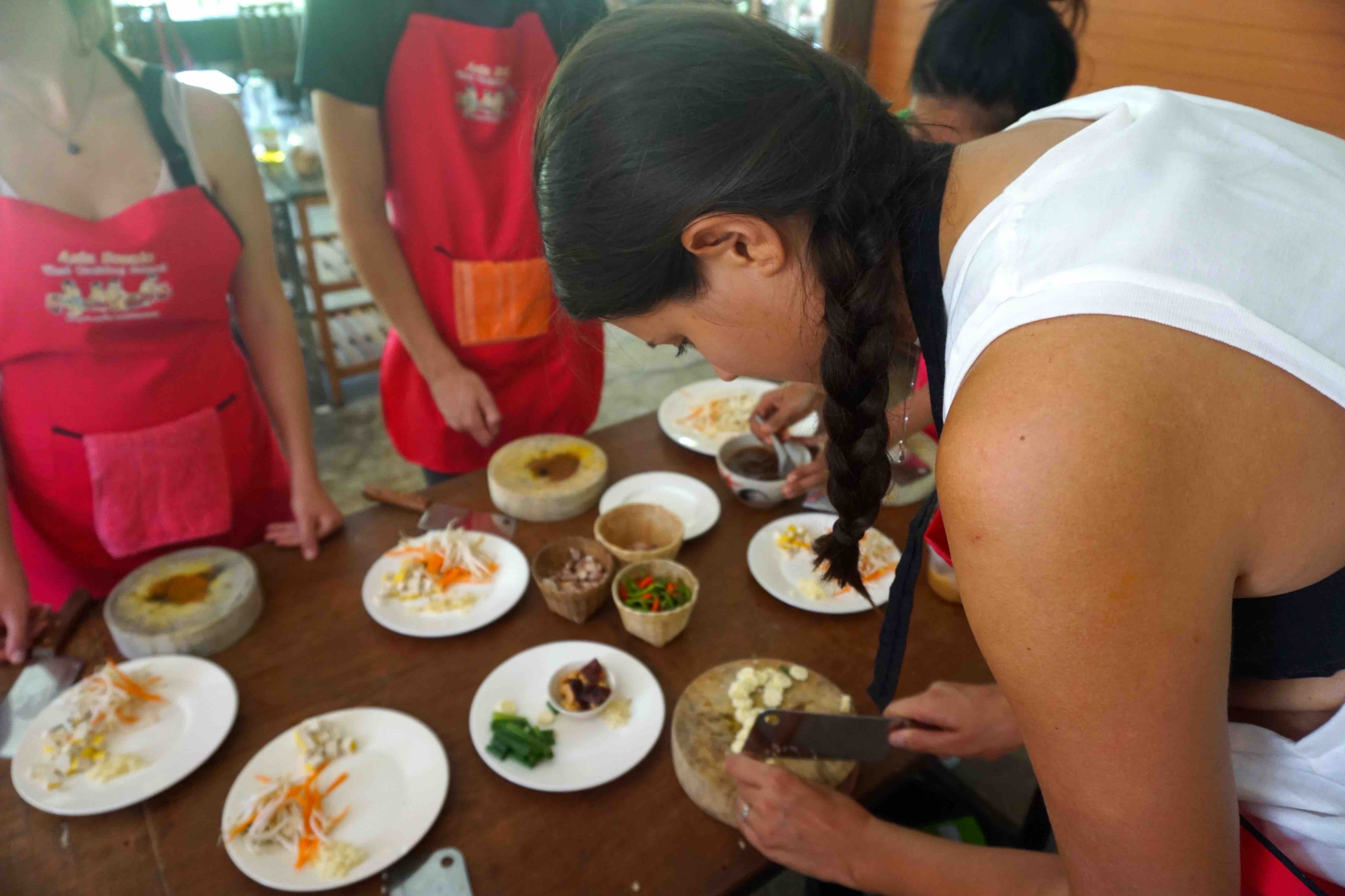 July 14, 2015 | talktraveltome | 3 Comments The title of this post might be a bit exaggerated, however we started writing this after having just completed a full day cooking class and we were still floating on cloud nine. It’s not everyday we get to cook seven courses of delicious Thai food! With that said, we are fully aware that Tom Colicchio and Anthony Bourdain won’t be knocking on our door, begging us to dazzle them with our cooking skills… but let us stay in foodie heaven a little longer and tell you about our awesome cooking experience! Chiang Mai is home to several cooking schools and it can be a bit overwhelming when deciding which one to go with. How do you know which school has that extra something-something letting you know you’ve picked the right place? Well after spending the day with Asia Scenic Thai Cooking School, we can say we’ve found one with some extra spice! Asia Scenic Thai Cooking School is run by Gayray and her sister Moon. They’ve created a cooking course that not only allowed us to whip up some classic Thai dishes, but also taught us about the food that is such an integral part of the Thai culture. When booking with this school there are two options of where you can actually take the cooking class: in town or at their farm. The farm course also brings you to the Maejo Market to pick up the local ingredients. Obviously, we went with the farm course as we’ve become somewhat obsessed with fresh food during our travels and thought this would be a perfect fit for us. We met our cooking instructor Indy (one of the funniest people we’ve encountered, but more on that later) in town and pilled into a van with 10 other fellow beginner chefs. During our market trip, Indy walked us around and gave us the inside scoop on all the different ingredients we would be cooking with. We now know difference between sticky rice and normal rice… Finally! After she gave us a tour of the market, we had some free time to do some exploring on our own. Getting lost in markets is one of our favorite things, so we were happy to weave in and out of fresh vegetables and rub elbows with the locals! After our visit to the Maejo Market we made our way to where all the magic happens… the farm! The farm at Asia Scenic was a little hidden paradise for those looking to see more of what Chiang Mai has to offer. It’s filled with organic vegetables, herbs and we even got up close to some doves! Yes, doves… because obviously the best cooking class in Chiang Mai would have doves. Don’t worry though, they were just for looking at… no dove stir fry on our menu! (Did we just put the image of dove stir fry in your head? That was a little dark, sorry!) We also had the opportunity to put on some super chic rice paddy hats and take a tour of the farm. They don’t use any chemicals making everything 100% organic, which allowed us to pick and try things while walking around! So now for the most epic menu of Thai food which we cooked with all our heart and soul! We were given an option of several dishes to choose from which included our choice of stir fry, salad, soup, dessert, spring roll, curry paste and curry. Since we wanted to try as much as possible, we each picked different dishes for all our courses. Sharing meals… one of the many perks of traveling with your significant other! Once we decided on what we wanted to cook, it was time for test our skills and play the role we were meant for… Chiang Mai’s next top chefs! This is where we want to give a round-of-applause for Indy, our fearless, hilarious, leader and by far the best cooking instructor! As she put it, we had to cook with our emotions, and that we did (one of us may have been a little too emotionally liberal with the salt). During our full-day class we cooked 7 dishes and then devoured 7 meals which made for a perfect day! Here is the lengthly list of dishes we cooked: pad thai, cashew nut with chicken, chicken spicy salad, papaya salad, tom yum soup, coconut milk soup, spring rolls, sticky rice with mango, deep fried bananas, panang curry and khaw soi curry. Our Thai restaurant will be opening soon! After cooking our Thai dishes we rested with our “food babies” on the hammocks and took in the beauty of the organic farm. It was truly an incredible day, and an extra perk of taking this class was receiving Gayray’s cookbook. Besides the recipes for the dishes we made it also includes some valuable advice for all you smart independent women looking to change the world. Gayray said it perfectly, “We want to show everyone in the world that Thai women can run a business without a rich boyfriend!” Girl power! Thank you Asia Scenic Thai Cooking School for hosting us during our trip! As always, our opinions are our own as we Talk Travel.